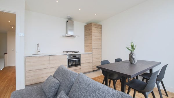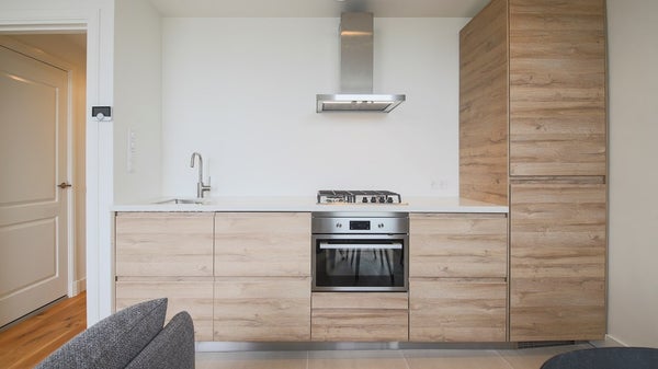 Entree op de derde verdieping naar de woonkamer met open keuken en openslaande deuren naar het dakterras op de vierde verdieping. Open keuken met diverse inbouwapparatuur, zoals vaatwasser en oven/ magnetron. Badkamer met inloopdouche en dubbele wastafel, apart toilet. Ruime slaapkamer aan de voorzijde van het appartement.