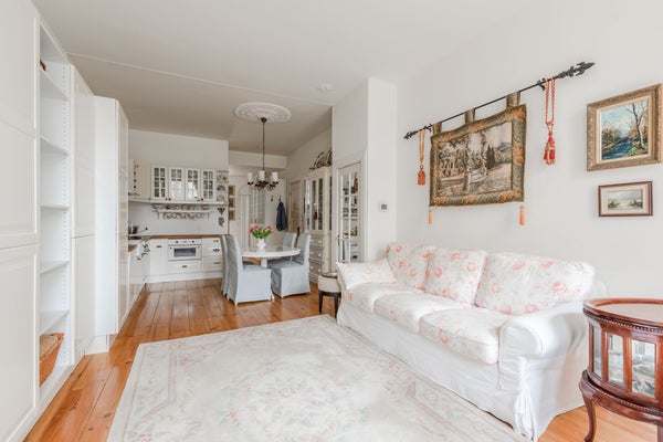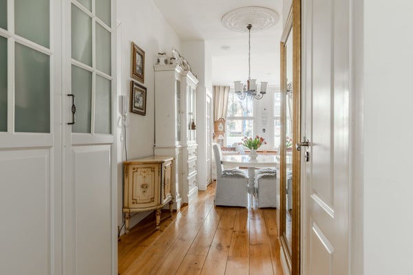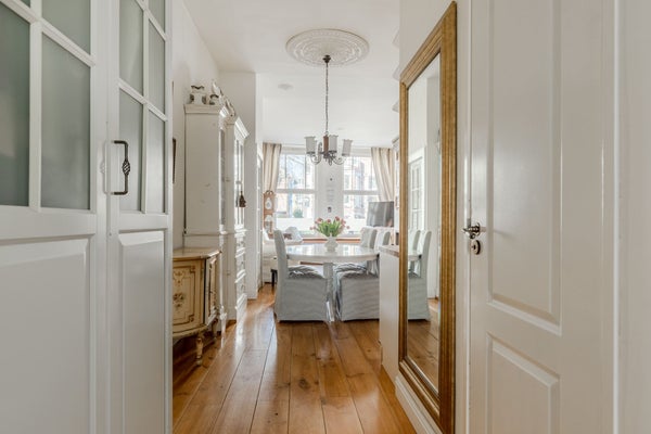 De woonkamer aan de voorzijde heeft een houten vloer, open haard en is zeer ruimtelijk door de hoge plafonds (3.07 meter). In het midden van het appartement ligt de zeer mooie open keuken met daarnaast de badkamer met bad, regendouche en wastafelmeubel.