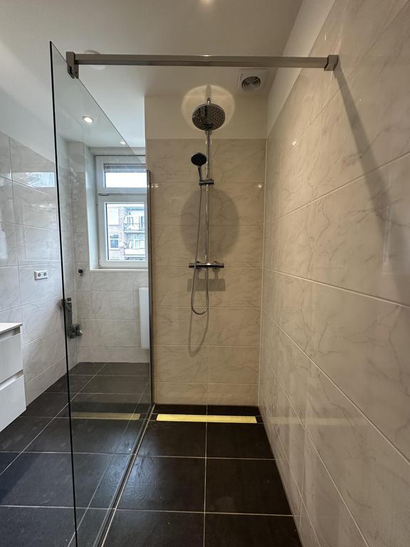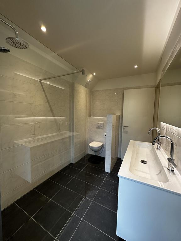 De frisse badkamer heeft een inloopdouche en wastafel. Er is een apart toilet aanwezig.