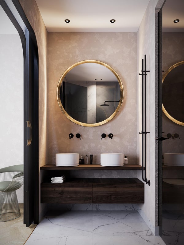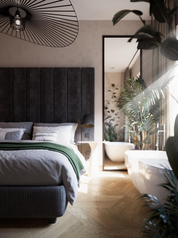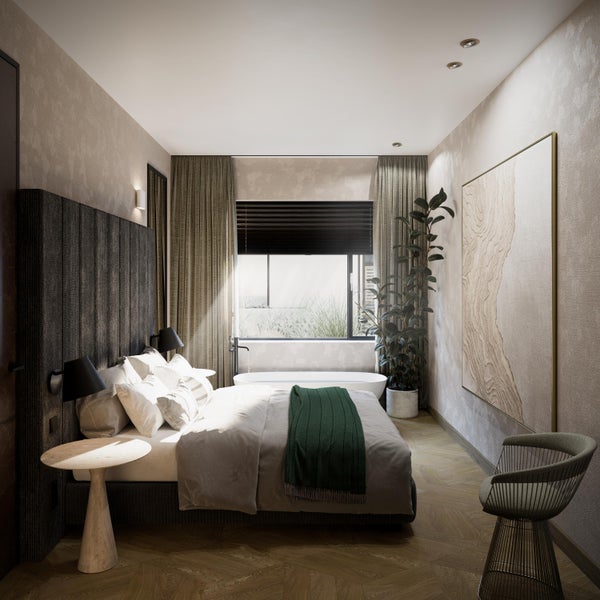 De slaapkamer met een prachtig vrijstaand bad is gelegen aan de voorzijde. De badkamer en-suite is afgewerkt met keramische marmerlook tegels en beton ciré en is voorzien van een luxe inloopdouche, badkamermeubel met dubbele wastafel en een toilet.