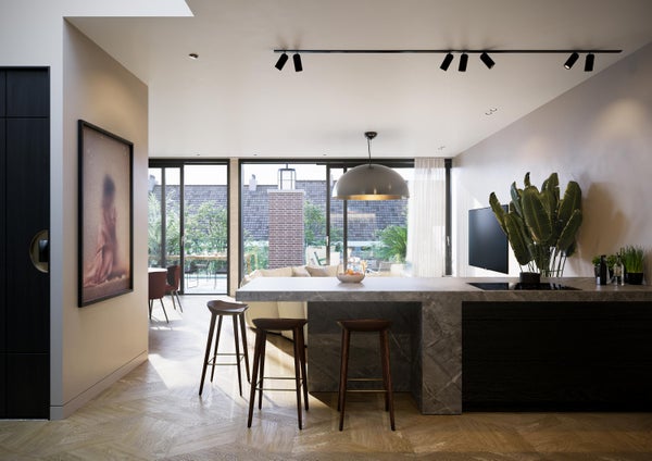 De woonkamer met luxe open keuken bevindt zich aan de Geulstraatzijde. De grote raampartijen in combinatie met het daklicht, zorgen voor een fantastische hoeveelheid licht en ruimte!