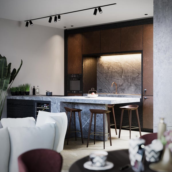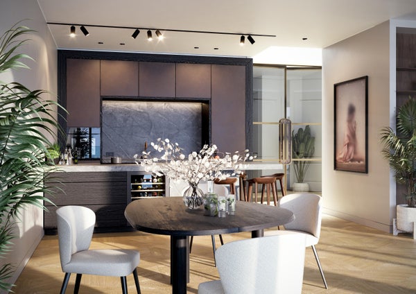 Het gehele appartement is voorzien van een eikenhouten vloer in hexagon patroon, messing deuren en Modular in- en opbouwspots in de zwarte en gouden afwerking.
