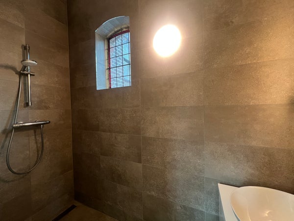 Via een stijlvolle trap bereikt u de woonkamer, waar de charme van het gebouw volledig tot zijn recht komt. De spots in het plafond zorgen voor een moderne verlichting, terwijl de glas-in-loodramen een prachtig lichtspel creëren en de ruimte een bijzondere sfeer geven.