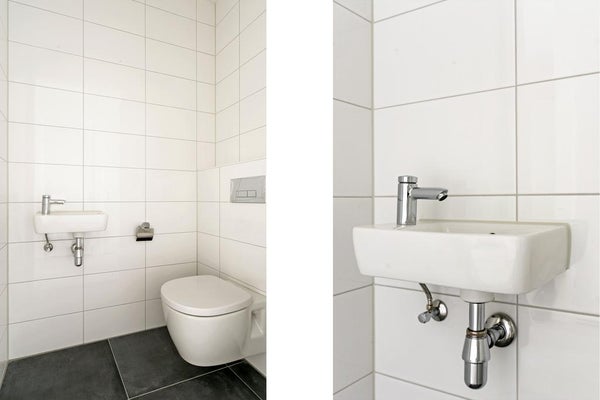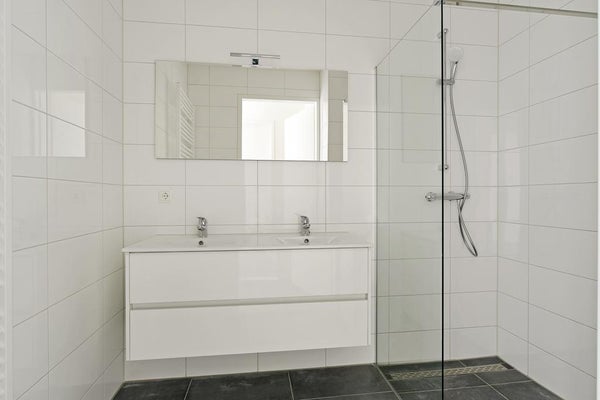 De badkamer is strak afgewerkt en beschikt over een aparte douche, dubbele wastafel met kranen en een grote spiegel. Zowel de badkamer als de separate toiletruimte zijn volledig betegeld en modern afgewerkt.