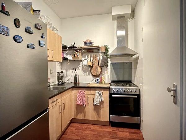 De ruime woonkamer heeft grote ramen die open kunnen, waardoor er veel licht binnenkomt. De open keuken is voorzien van een afzuigkap en geeft toegang tot een handige inpandige berging met wasmachineaansluiting.