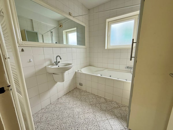Overloop met toegang naar de 2 ruime slaapkamers en een aparte kastenkamer. De moderne badkamer is voorzien van een wastafel en een ligbad.