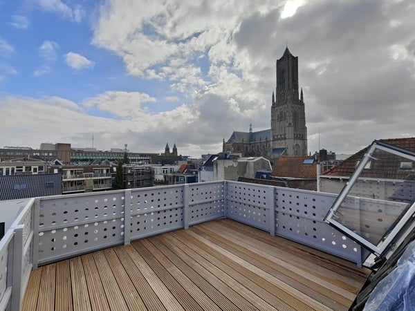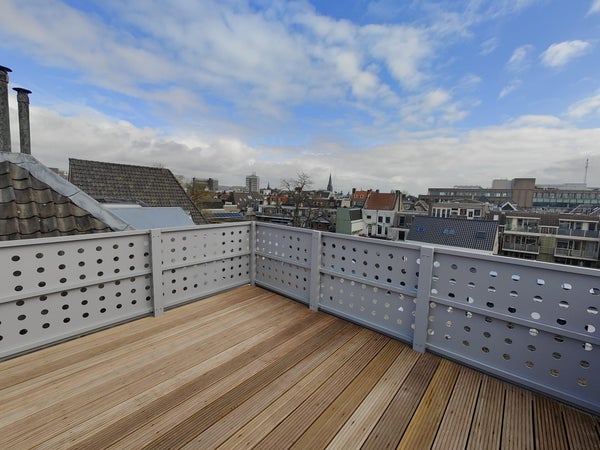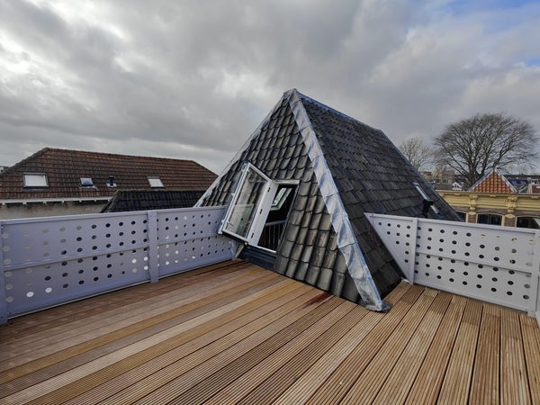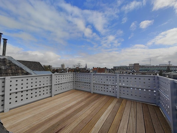 Op deze tweede woonlaag bevinden zich een royale open ruimte én toegang tot een ruim dakterras met een prachtig uitzicht over de groene binnentuinen van de binnenstad—een heerlijke plek om te ontspannen. Vanaf deze verdieping is tevens toegang tot de tweede slaapkamer.