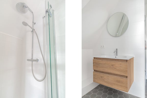 Ook de badkamer is volledig uitgerust en voorzien van een douchecabine, ligbad, wasmachine-aansluiting en stijlvol wastafelmeubel.