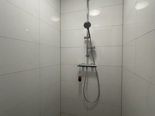 De slaapkamer heeft een nette wastafel en geeft toegang tot de douche. Het zwevend toilet is separaat gelegen.