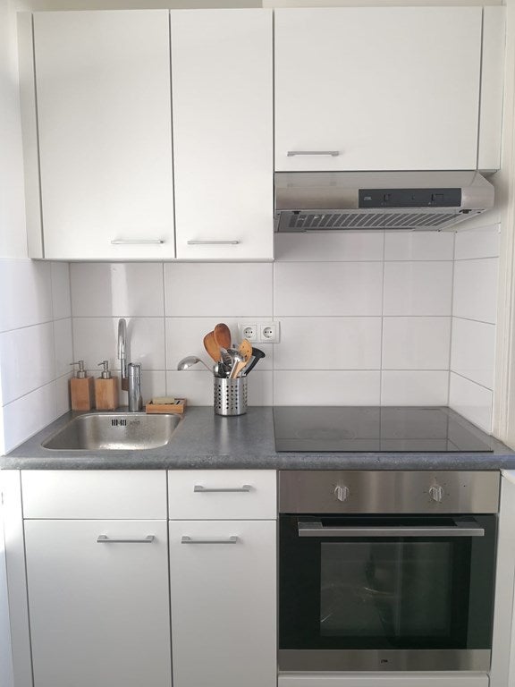 Deze semi-zelfstandige studio heeft een eigen aparte keuken met ingebouwde oven, inductieplaat en afzuigkap.