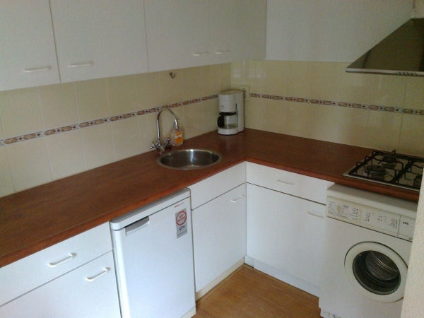 Opgang via eigen trap, open keuken met apparatuur (wasmachine, koelkast/vriezer, gasfornuis met afzuigkap en magnetron), badkamer met wastafel, toilet en douche, slaapkamer met inloopkast, lichte woonkamer.
