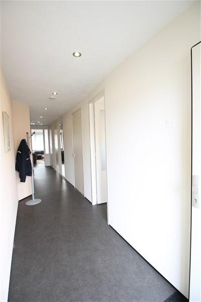 Via de trap bereikt u direct het dakterras van het appartement complex, gelegen op het noordoosten en voorzien van 4 appartementen naast elkaar gelegen. Via de voortuin is er direct toegang tot de langgerekte hal van waaruit alle ruimtes bereikbaar zijn. Aan de voorzijde de eerste ruime slaapkamer en iets verder de tweede ruime slaapkamer is mooi hoog en licht door het sheddak, de derde (was)kamer voorzien van een aanrecht, kastruimte, wasmachine en droger. Iets verder in de hal toegang tot het separate toilet en de badkamer met wastafelmeubel en douche. Aan de achterkant van het appartement bevindt zich de ruime woonkamer met keuken en eethoek. Vanuit de woonkamer is tevens direct toegang tot het balkon op het zuidwesten aan de achterzijde van het appartement.
