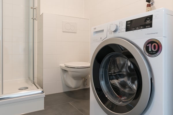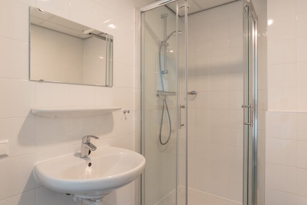 De badkamer is netjes afgewerkt en beschikt over een douche, wastafel, toilet en wasmachine.