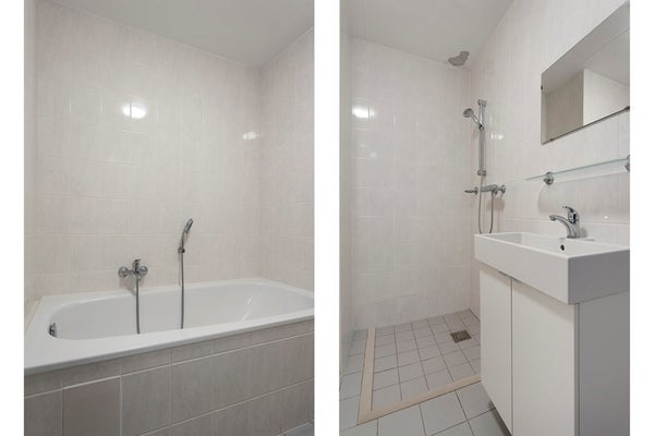 Terug in de hal vind je een apart toilet met fonteintje. Tegenover het toilet ligt de ruime badkamer, uitgerust met een ligbad, een separate inloopdouche en een wastafel. Ideaal om helemaal tot rust te komen.
