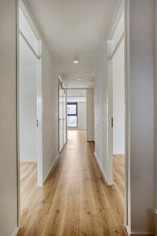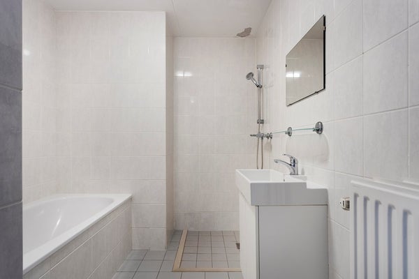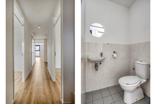 Via de hal in de woning heb je toegang tot alle ruimtes. Aan de achterzijde bevindt zich een ruime, lichte woonkamer met ramen die bijna van vloer tot plafond lopen. Hier is meer dan genoeg plek voor een grote zithoek, een eettafel en je persoonlijke inrichting.