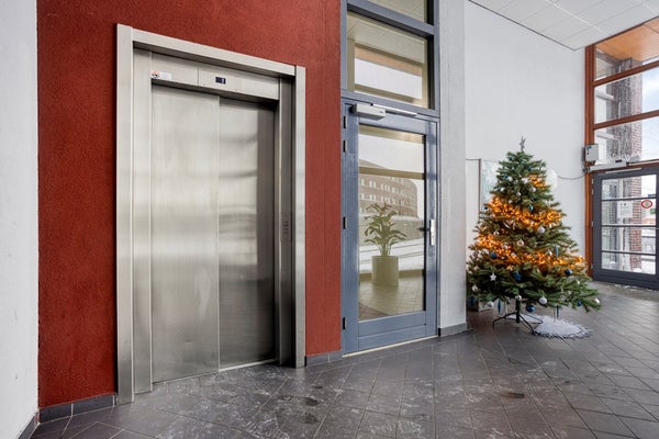 De hal op de begane grond biedt toegang tot de brievenbussen, de bergingen en de lift die je naar de tweede verdieping brengt.