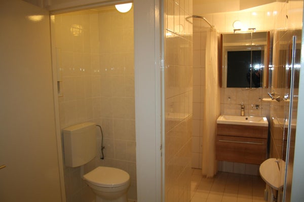 Geheel betegelde badkamer (2.40m2) met douche, badmeubel met wastafel.