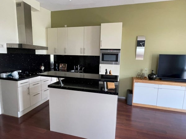 Entree appartement, gang, meterkast, (hang)toilet met fonteintje, inpandige bergruimte met cv-ketel en voorraadrekken, twee slaapkamers, badkamer met douche, breed wastafelmeubel, wasmachine en droger, ruime woonkamer met videofoon en openslaande deuren die toegang geven tot het royale aangrenzende balkon, open keuken met inbouwapparatuur waaronder een gasfornuis, afzuigkap, Quooker, koelkast, diepvries, combi-oven en vaatwasser