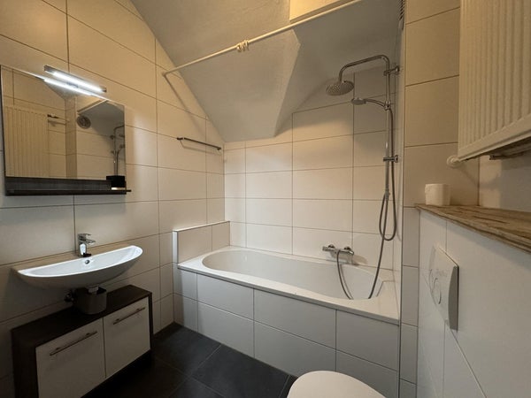 Aansluitend aan de woonkamer ligt een ruime moderne badkamer met ligbad en douche gelegenheid, hangend toilet, wastafel en spiegel met verlichting.
