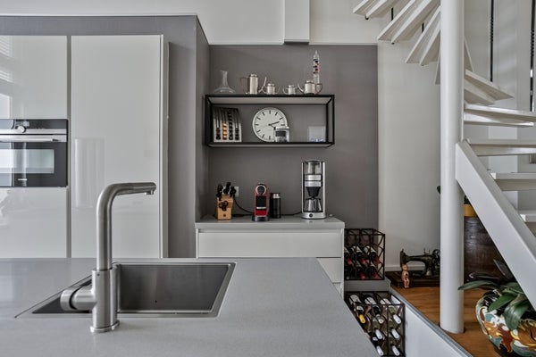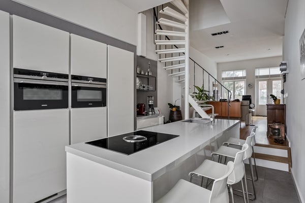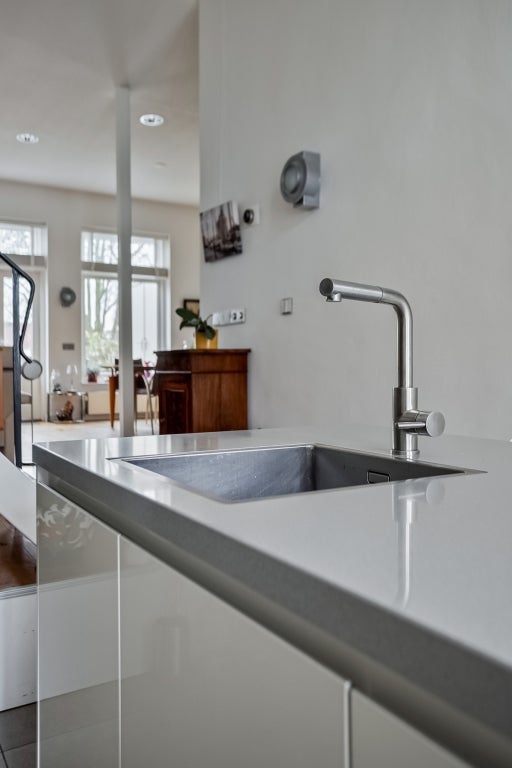 De keuken is volledig gemoderniseerd en uitgerust met hoogwaardige inbouwapparatuur, waaronder een kookplaat met inbouw afzuiging, een combi-magnetron en een sfeervolle koffiecorner. Aansluitend bevindt zich een handige berging, ideaal als extra voorraadruimte of voor het opbergen van huishoudelijke spullen.