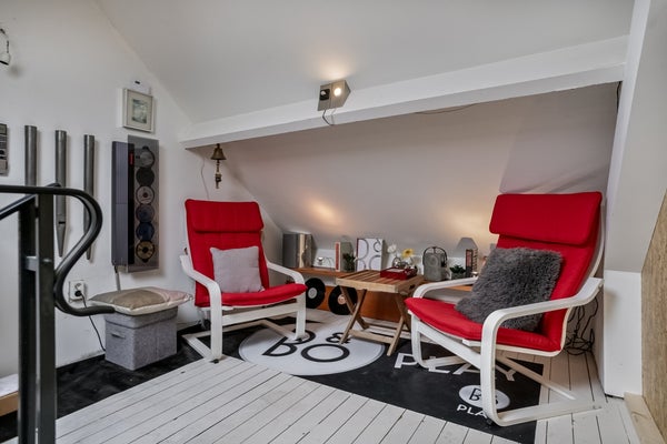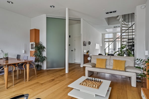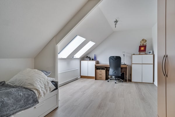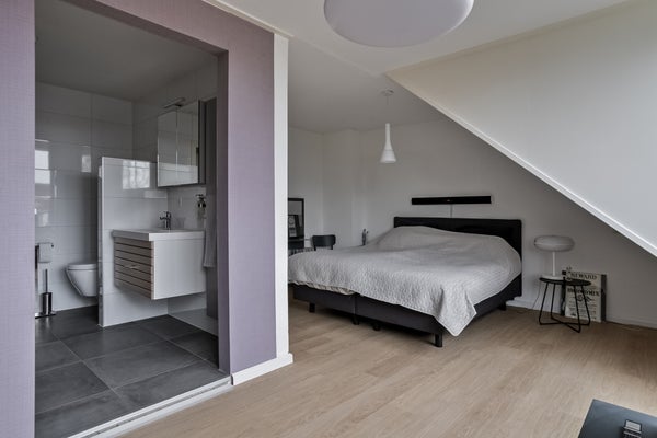 Een elegante wenteltrap leidt naar de bovenverdieping, waar zich twee ruime slaapkamers bevinden. De master bedroom beschikt over een directe toegang tot de moderne badkamer. Deze badkamer is stijlvol afgewerkt en voorzien van een inloopdouche en toilet. De tweede slaapkamer is eveneens ruim en biedt volop mogelijkheden, bijvoorbeeld als logeerkamer of werkkamer. De zolder beschikt een extra zitruimte om heerlijk te ontspannen.