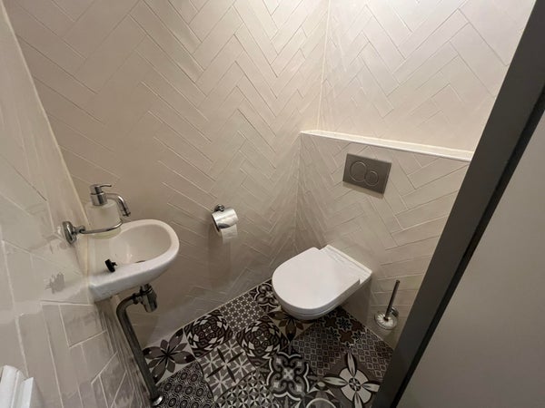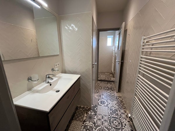 De badkamer is uitgerust met een douche, wastafel in meubel en handdoek radiatoren.