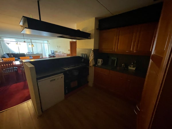 Semi-open keuken voorzien van een hoekopgesteld keukenblok met kunststof aanrechtblad en keramische kookplaat met afzuigkap, vaatwasser, oven en koelkast.