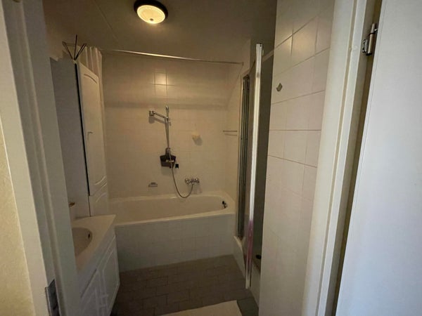 Betegelde badkamer met ligbad, aparte douche en een enkele wastafel in meubel.
