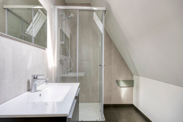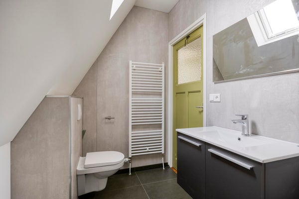 De badkamer is praktisch ingericht met een douche, wastafel en tweede toilet. Op de overloop is bovendien extra bergruimte aanwezig dankzij de ingebouwde kasten, ideaal voor linnengoed of seizoensopslag.