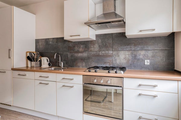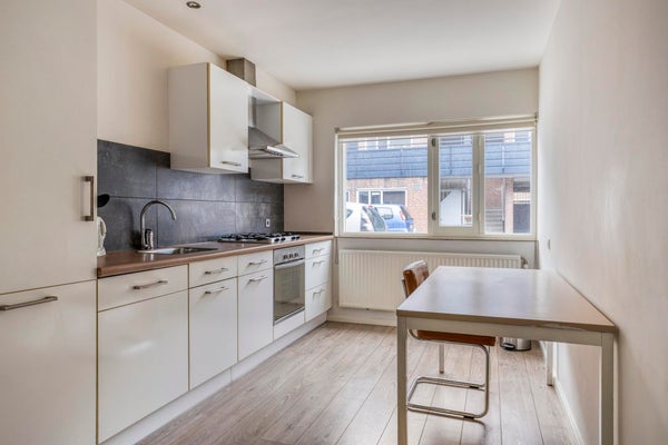 De open keuken is gelegen aan de straatzijde / voorzijde van het appartement. Voorzien van een laminaatvloer en een kunststof keukenblok met gaskookplaat, afzuigkap, oven, vaatwasser koelkast en vriezer.