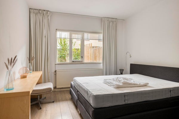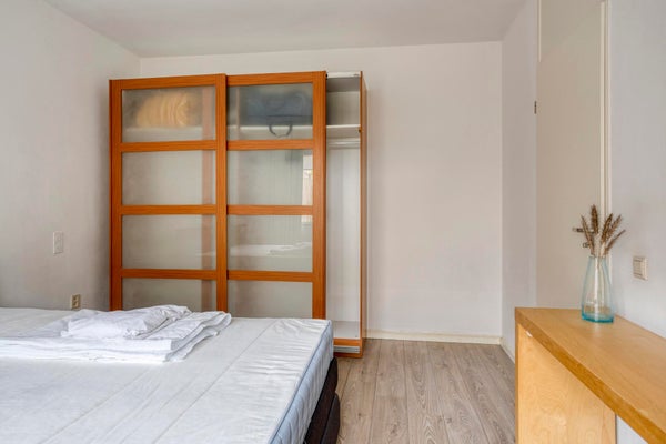 De slaapkamer is gelegen aan de achterzijde en is v.v. een laminaatvloer, 2-persoonsbed, kledingkast en een sidetable.