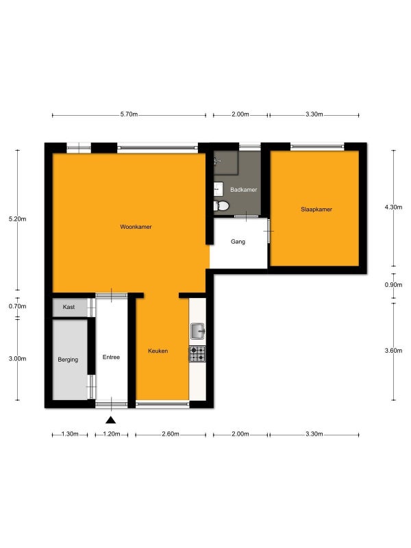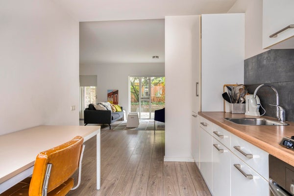 Vanuit de woonkamer is er een open doorloop naar de keuken en de badkamer en slaapkamer.
