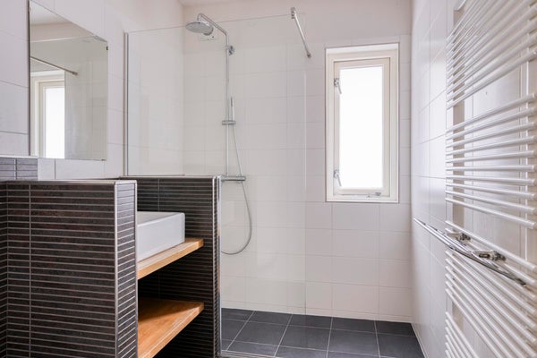 Een nette en volledig betegelde badkamer v.v. inloopdouche, wastafelmeubel, design radiator en toilet.