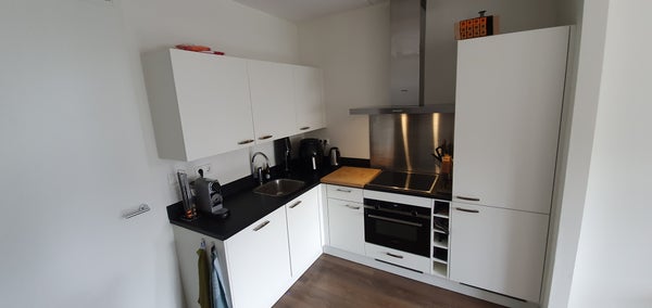 - Woonkamer met open keuken voorzien van diverse inbouwapparatuur waaronder koelkast, vriezer, vaatwasser, inductiekookplaat en afzuigkap;