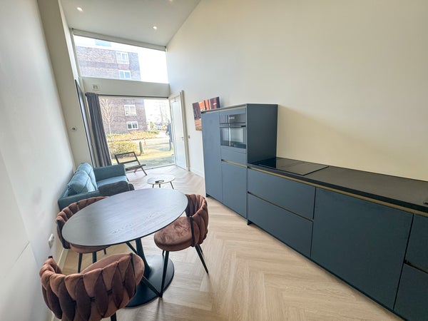 - Open woonruimte met hoge plafonds die een extra ruimtelijk gevoel geven