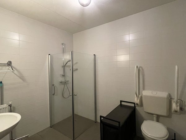 De ruime, nette badkamer is voorzien van een wastafel met spiegel, een douche en tweede toilet.