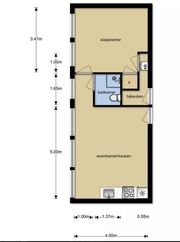 Indeling: de woonkamer heeft een open keuken die is voorzien van diverse inbouwapparatuur, badkamer met douche, toilet en dubbele wastafel. Zeer ruime slaapkamer met inbouwkast voor extra opbergruimte. De extra berging met wasmachine-aansluiting bevindt zich op de gang.