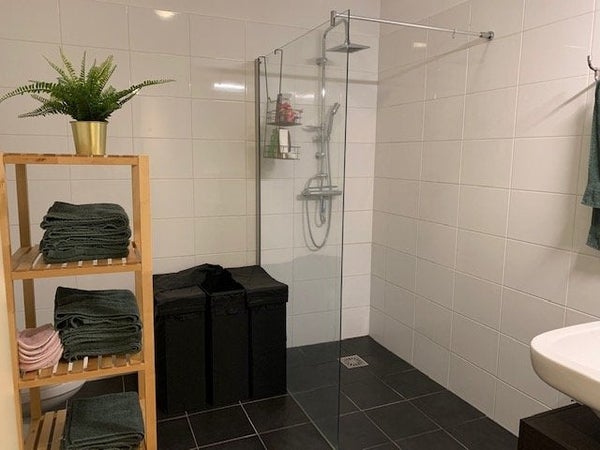 Betegelde badkamer van ca. 6m² met douche, toilet en vaste wastafel.
