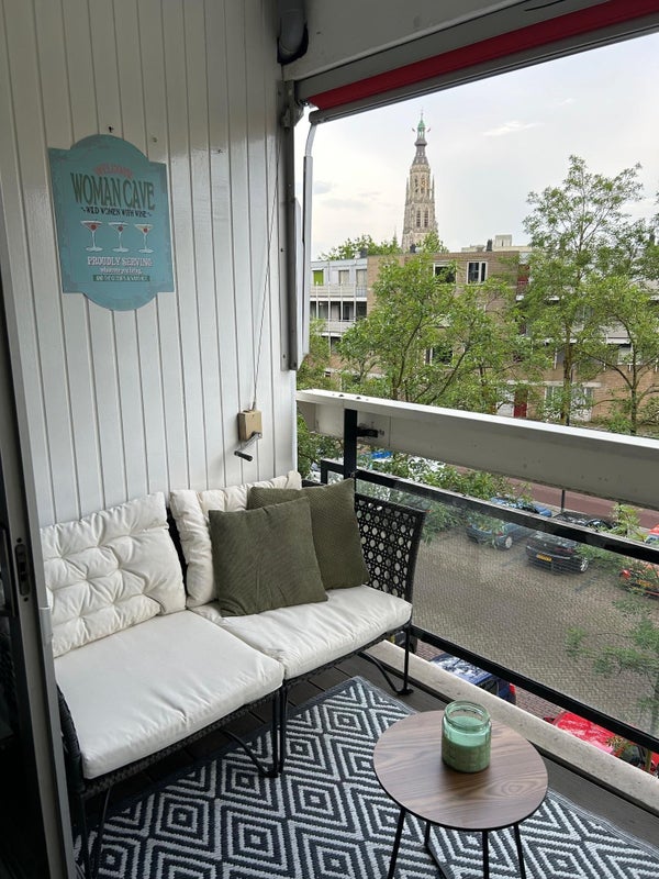 Via de woonkamer is de loggia met uitzicht op de Grote Kerk te bereiken.