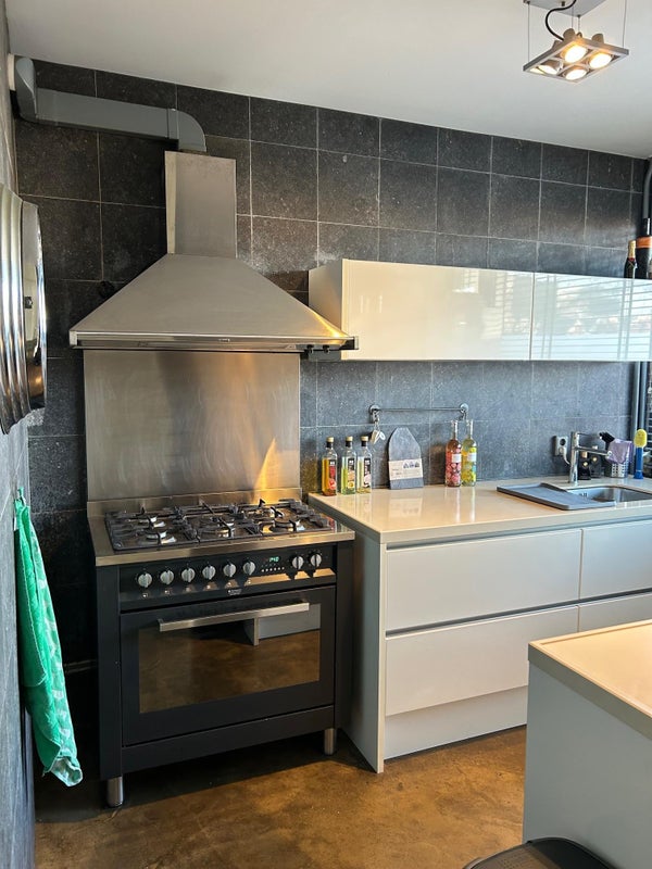 De keuken heeft een strakke uitstraling met lades en is compleet uitgerust met een 6 pits gasfornuis met oven en afzuigkap.
