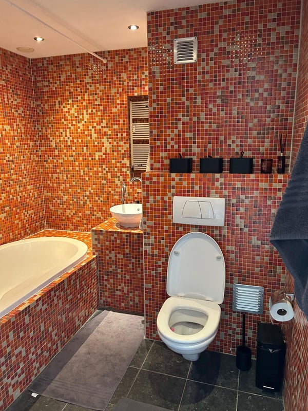 De badkamer is speels betegeld en voorzien van een toilet, wastafel en een ligbad met douchemogelijkheid.