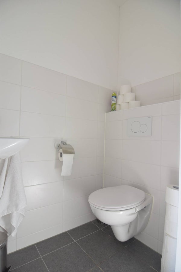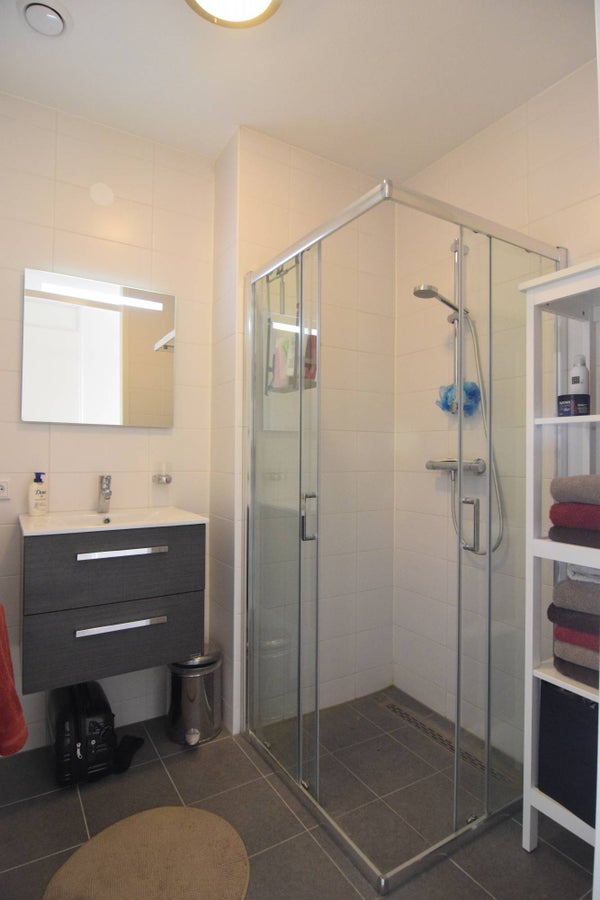 De badkamer is voorzien van een wastafel met wastafel en douche. In de hal is een separaat toilet.