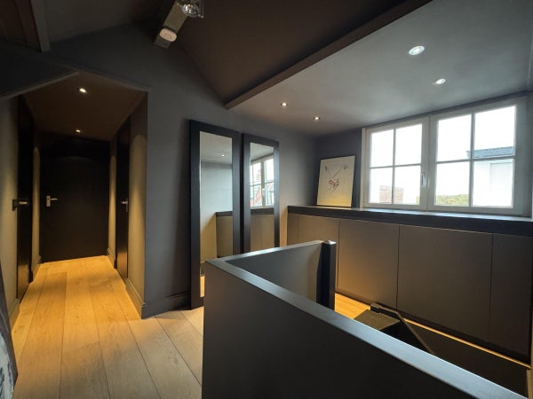 Overloop met toegang tot de riante woonkamer met grote raampartijen met uitzicht op het dakterras. De half open luxe keuken is modern en voorzien van de alle inbouwapparatuur.