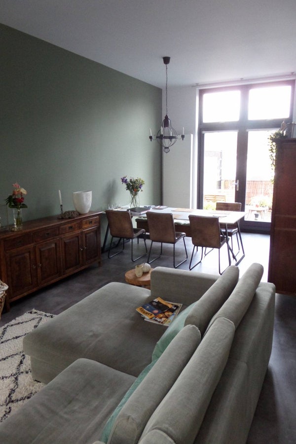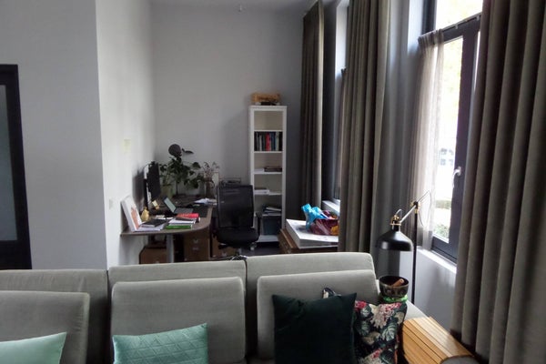 De vele, hoge ramen geven in de woonkamer veel licht .