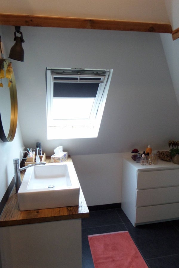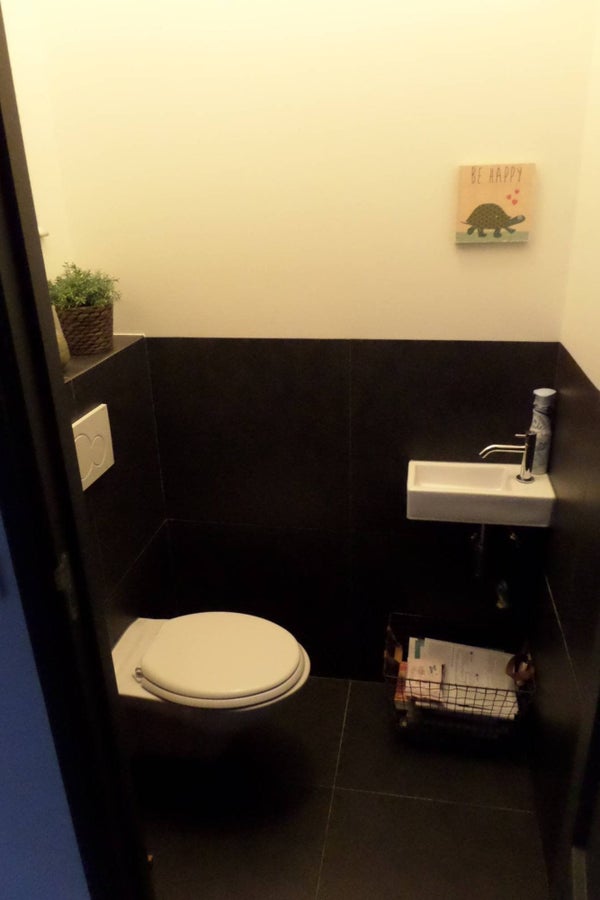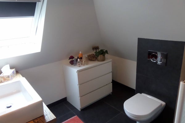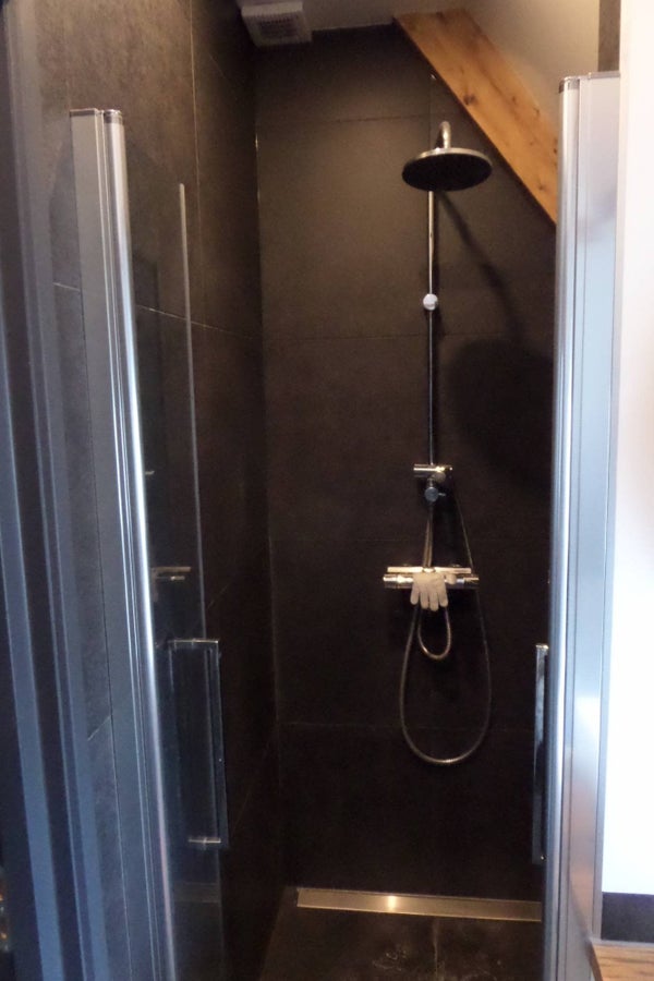 De badkamer is voorzien van een inloop douche, wastafel en toilet.