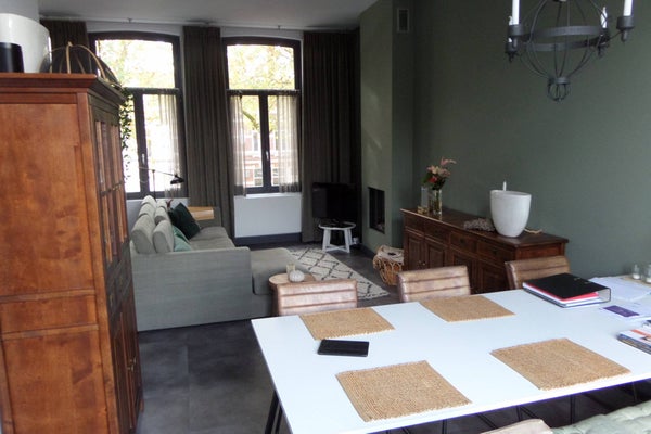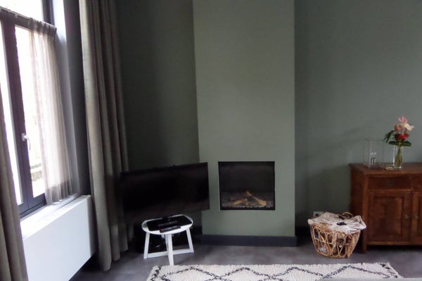 De woonkamer heeft hoge plafonds en er is een strakke moderne gashaard aanwezig. De oude elementen gecombineerd met de strakke moderne afwerking geeft een luxe loft gevoel.
