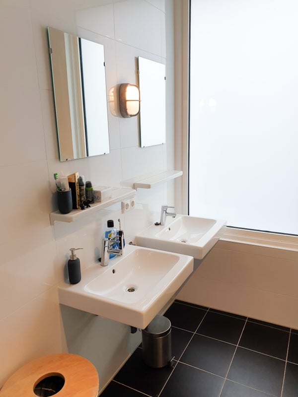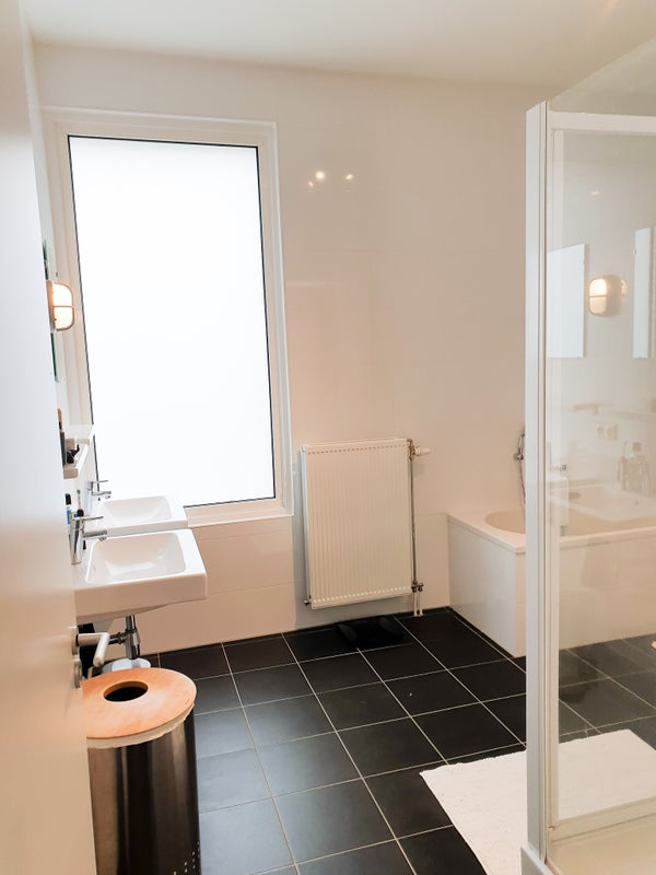 De badkamer is ingericht met een tweetal wastafels, een riant ligbad en een ruime douche. Tevens geeft dit toeging tot de ruimte met aansluiting voor een wasmachine en/of droger.