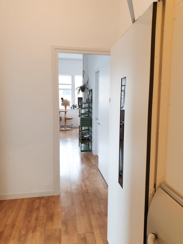 De hal geeft toegang tot de woonkamer, badkamer en berging.