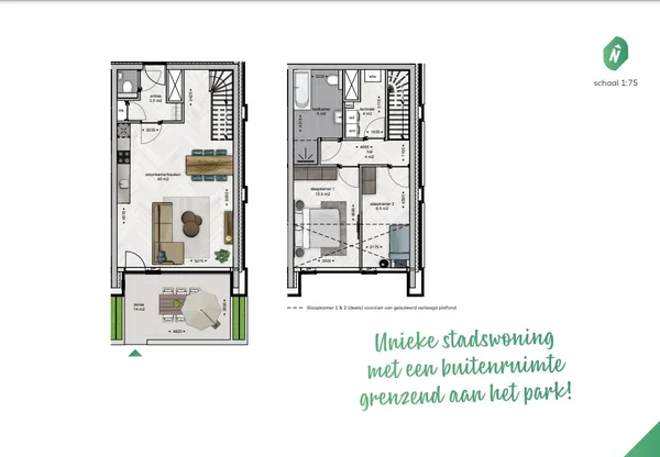 In de nieuwe autoluwe stadswijk EUREKA! Breda, nabij het historische centrum en het station, vindt u een unieke stadswoning. De woning beschikt over 2 slaapkamers, een luxe keuken en een terras dat aan een park grenst. Op de begane grond vindt u een royale living met een open keuken die toegang biedt tot het heerlijke terras. De eerste verdieping herbergt de 2 slaapkamers en een luxe badkamer met ligbad en inloopdouche. U heeft ook een privé parkeerplaats en een berging tot uw beschikking. Met een gebruiksoppervlakte van ca. 92,5 m² en een terras van 14 m², biedt deze woning vloerverwarming, hoogwaardige isolatie en een centraal WKO-systeem. EUREKA! Breda combineert wonen in het centrum met een uitstekende bereikbaarheid, waardoor steden als Rotterdam en Eindhoven gemakkelijk te bereiken zijn.