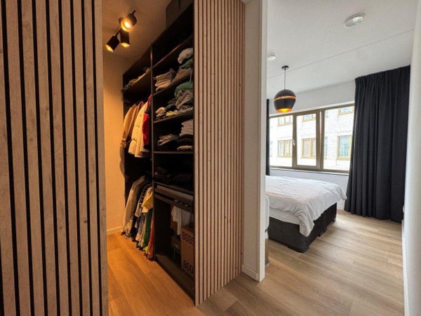 Ruime slaapkamer met walk in closet en pvc vloer.